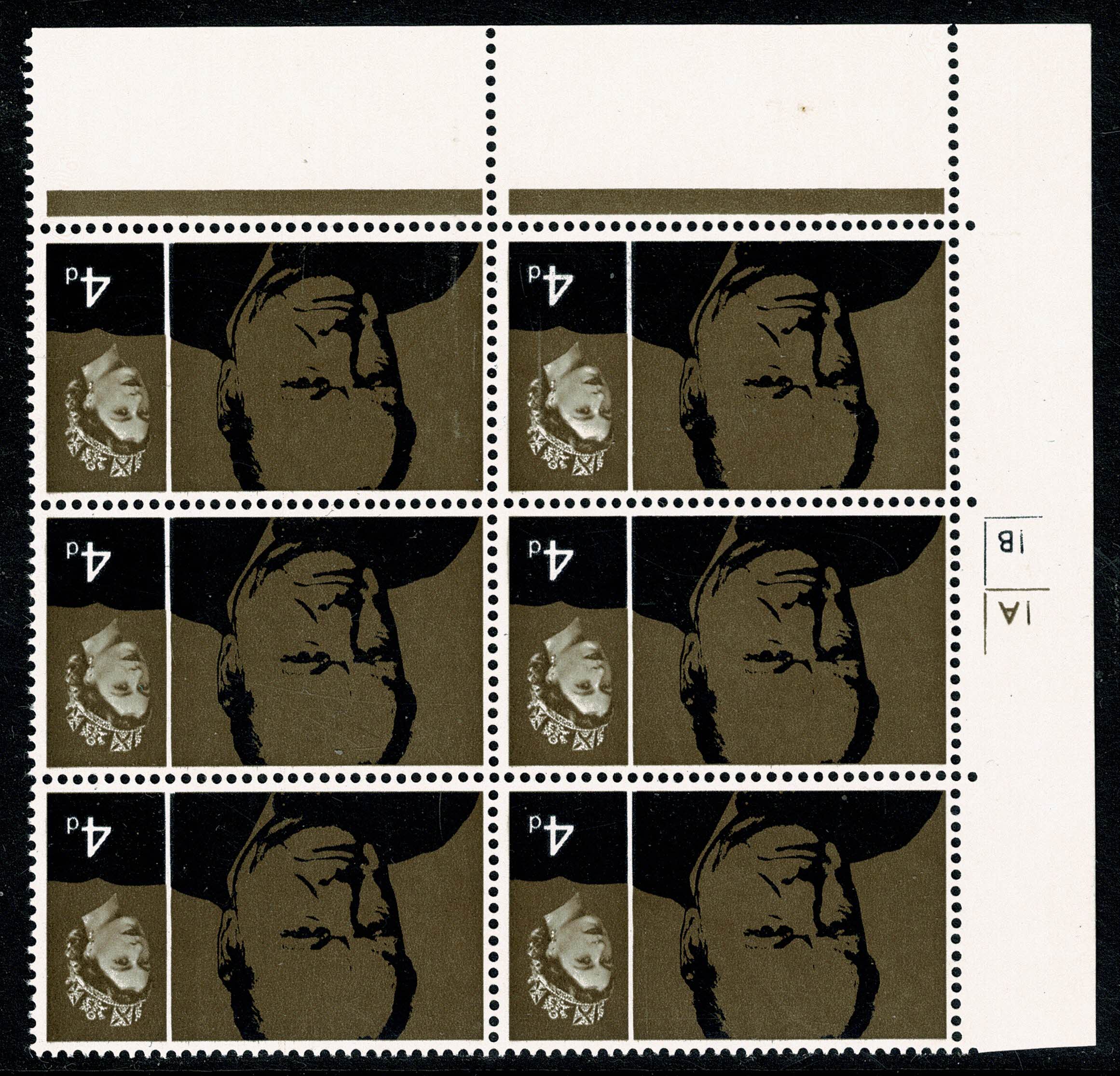 1965 Churchill 4d (Rembrandt). Cylinder 1A 1B no dot block of six WATERMARK INVERTED. SG 661Wi