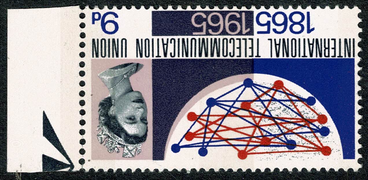 Unmounted Mint marginal single (5 perfs seperated between stamp and margin, visible on scan). 1965 I.T.U. 9d (phos). WATERMARK INVERTED. As illustrated