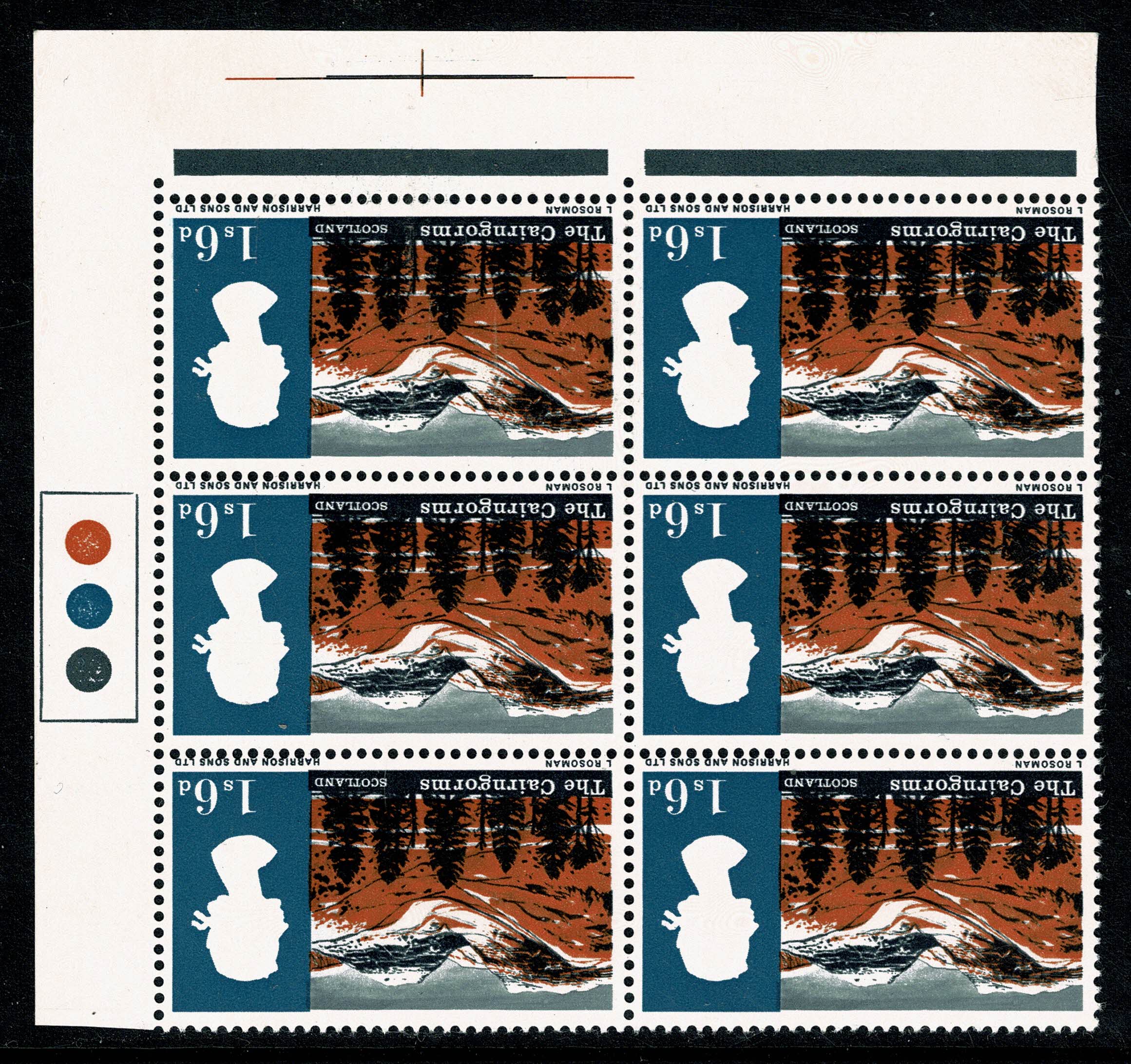 1966 Landscapes 1/6 (ord). Traffic Light block of six. WATERMARK INVERTED. SG 692Wi.