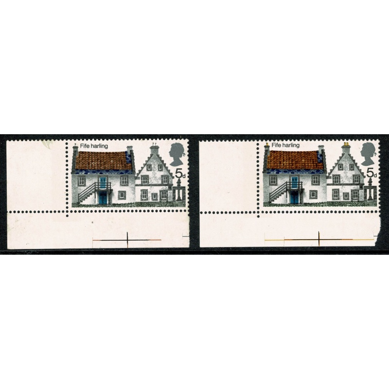 Unmounted mint lower left corner single with error MISSING LEMON (lemon colour missing from ALL chimney pots and missing yellow toning to roof). Illustrated and supplied with matching normal at right. The lower margin demonstrates absence of yellow registration cross.