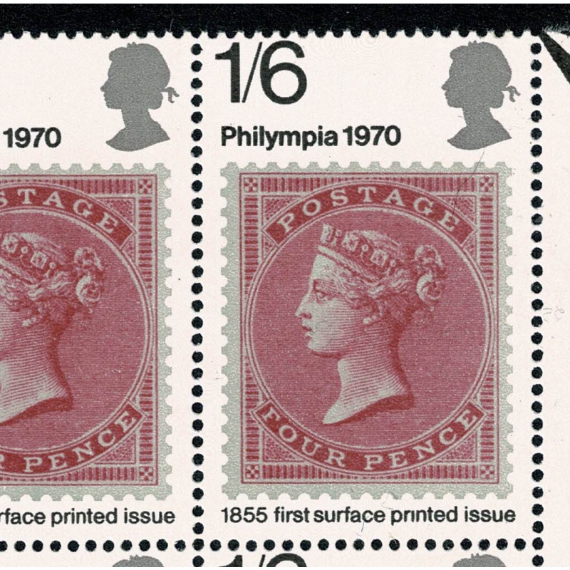 1970 Philympia 1/6 MISSING PHOSPHOR. Unmounted mint unfolded positional block of six with listed variety "missing dot above i of printed" SG Spec. W197b. R 6/12.