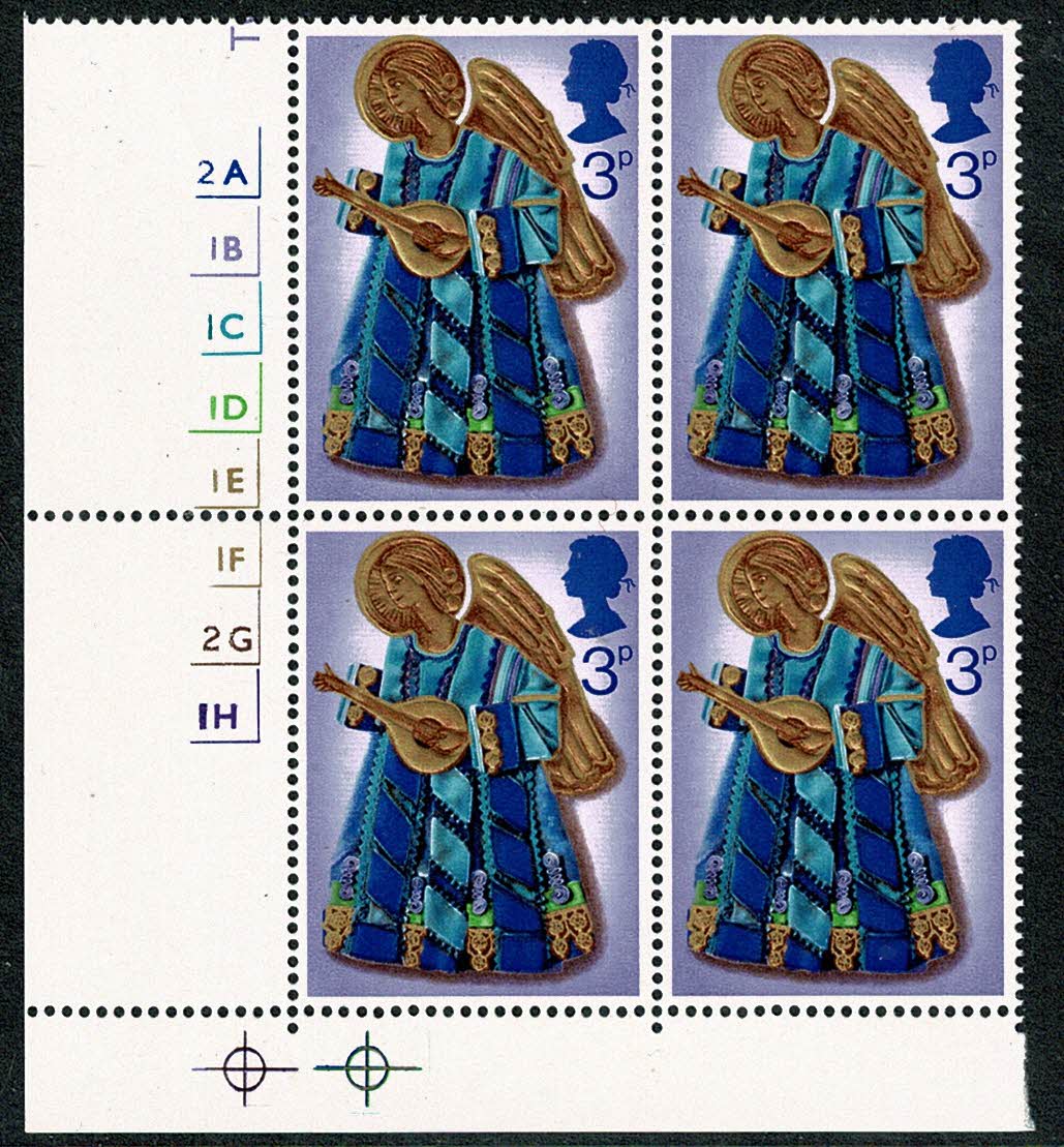 1972 Christmas 3p MISSING PHOSPHOR. Cylinder block of four. SG 914y