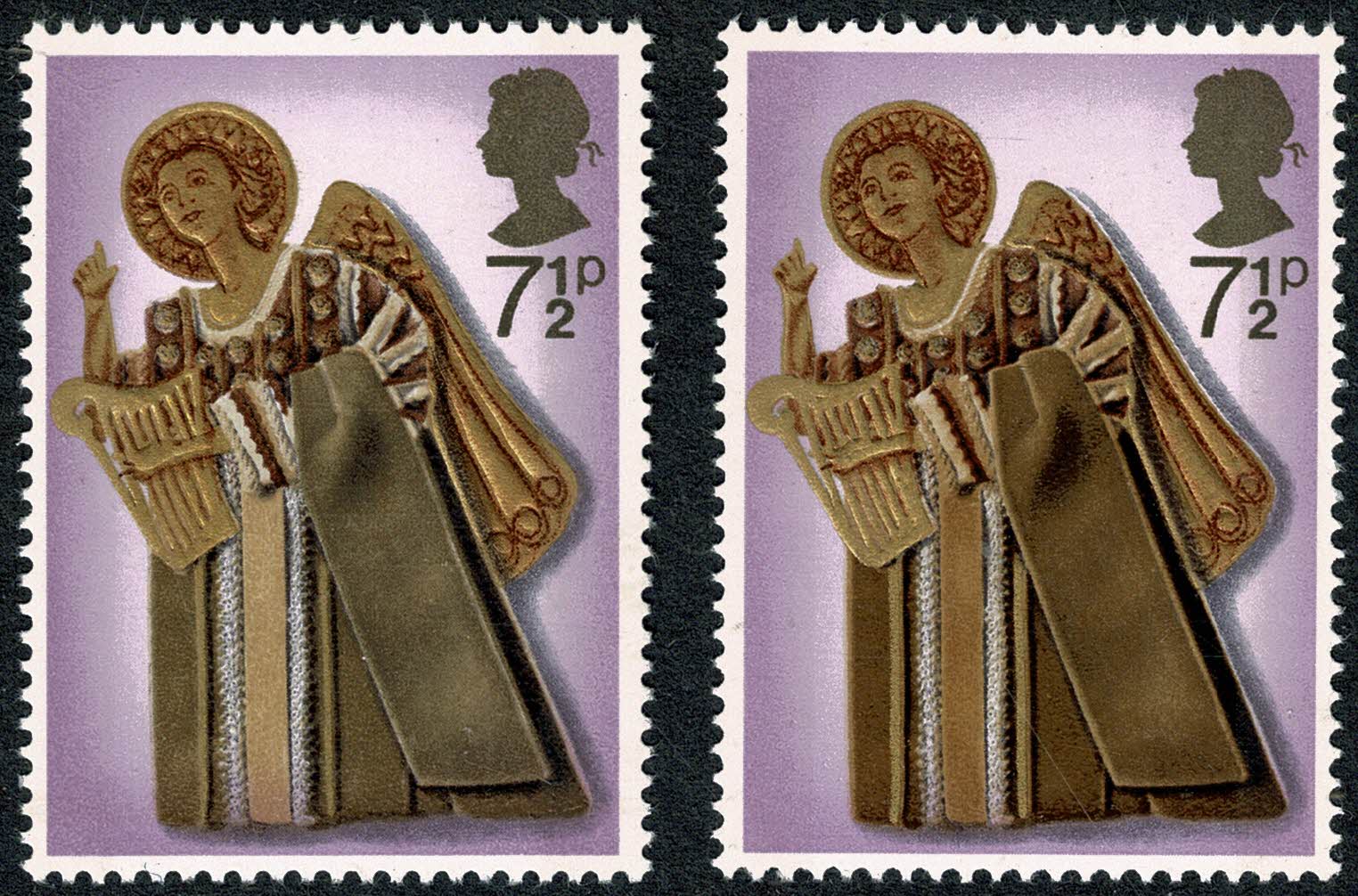 Unmounted mint single error MISSING OCHRE. Affects Angel's robes and particularly noted in markedly paler appearance of central vertical stripe and edging around neck. Illustrated and supplied with normal at right.
