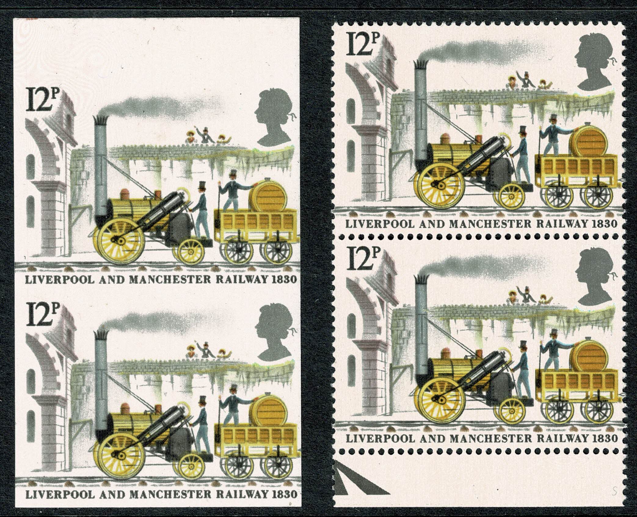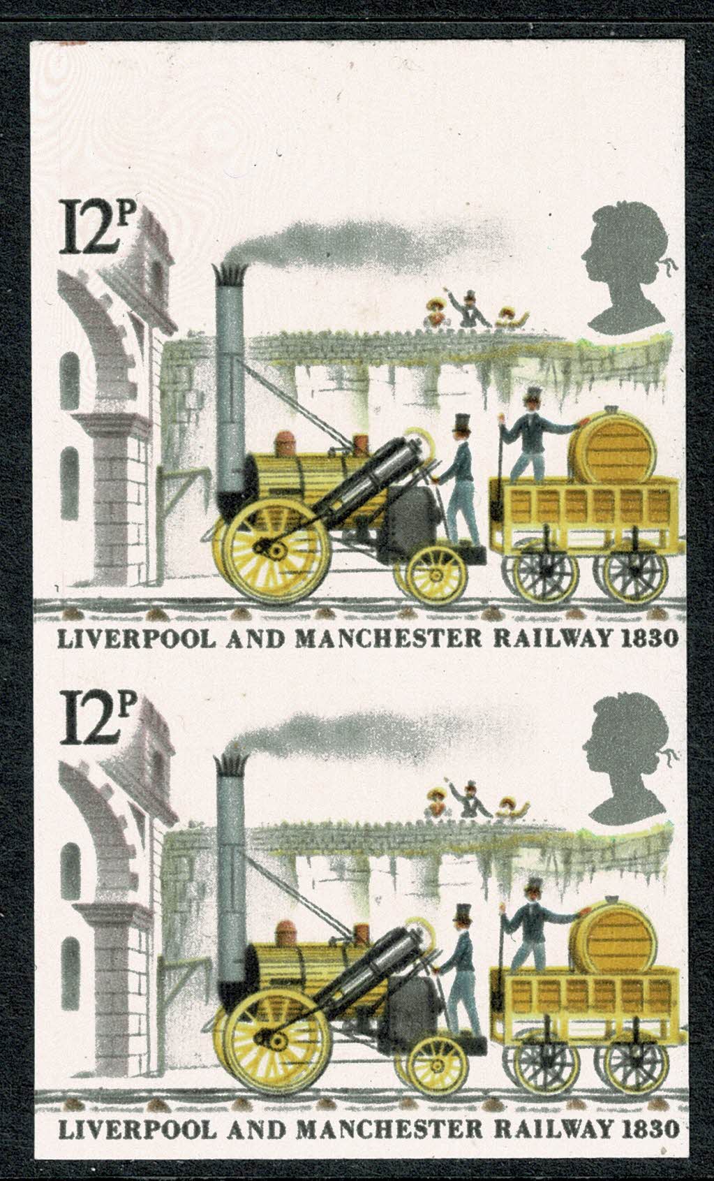 1980 150th Anniv. Liverpool & Manchester Railway. COMPLETELY IMPERF 12p Vertical pair. SG 1113 var