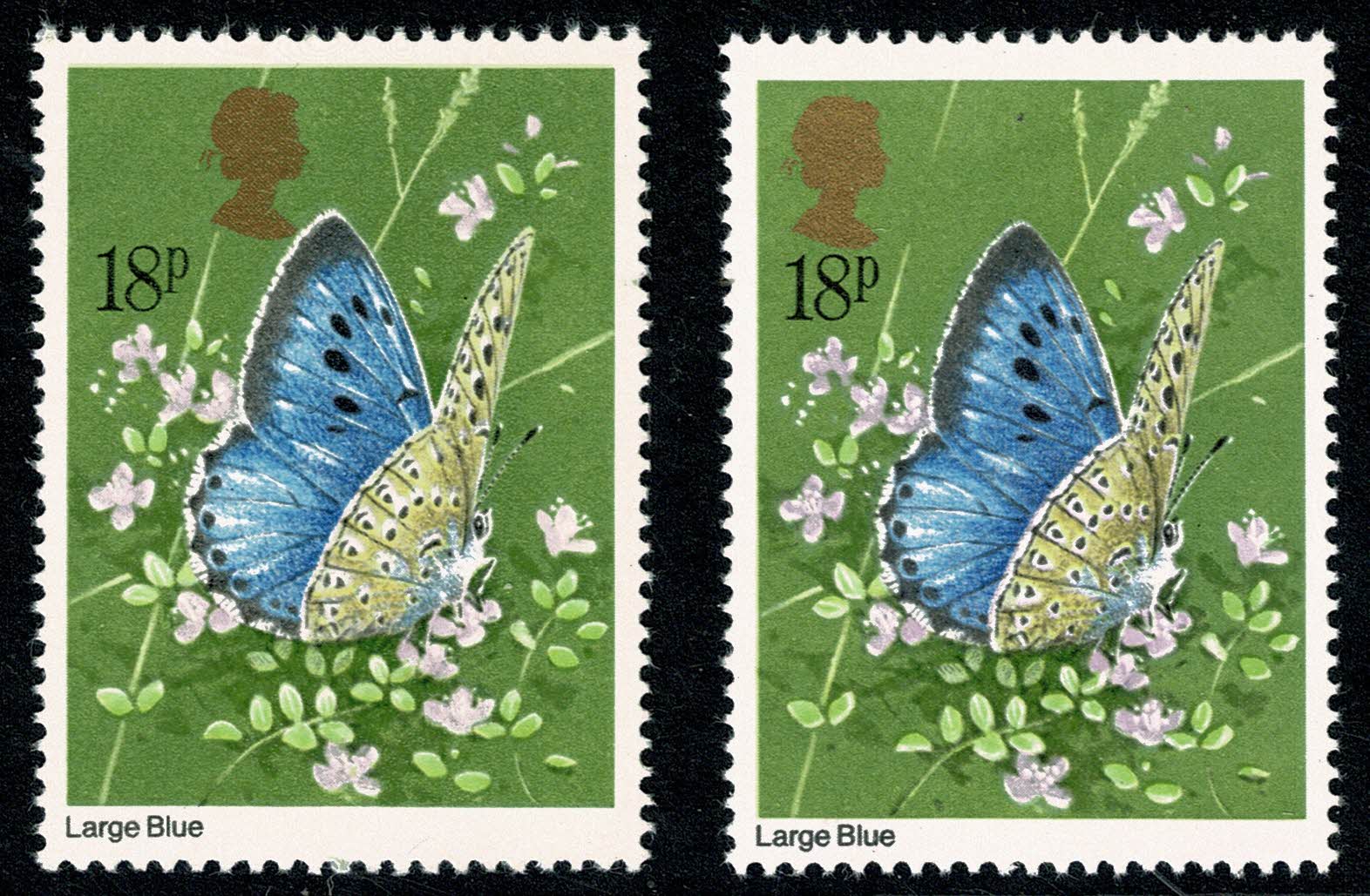 UM single with the largest of the gold shifts ( 5mm to right) on this value. Queen's head now touches butterfly's wing Illustrated and supplied with normal at right.